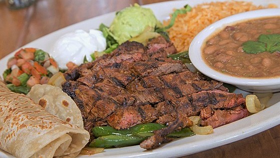 (Serves 4) Beef fajitas, grilled onions, poblano peppers, shredded cheddar cheese, pico de gallo, sour cream, guacamole, homemade flour tortillas, fresh roasted tomato salsa, chips, Mexican rice an...