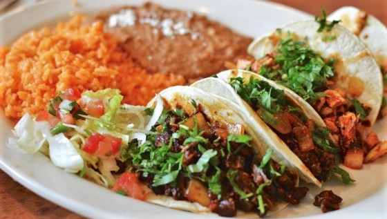 Two tacos on flour tortillas with your choice of protein, served with rice, charro beans, guacamole, sour cream and pico.