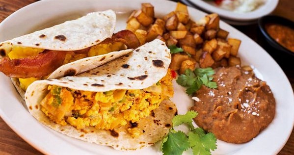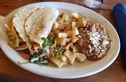 Scrambled eggs, jalapenos, onions, cheddar cheese, tortilla strips and salsa. Served with skillet potatoes, refried beans and two flour tortillas.