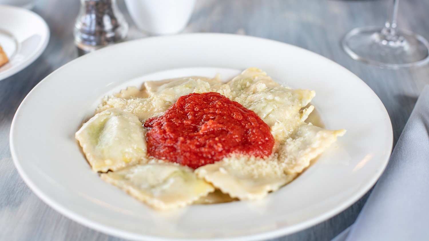 House made large ravioli with spinach, ricotta cheese and pancetta. In Bechamel cream sauce and pomodoro sauce.