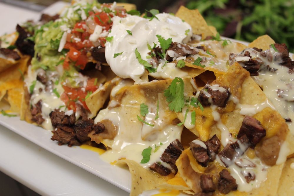 Refried beans, picadillo, black bean relish, jalapenos, sour cream, queso and pico de gallo.