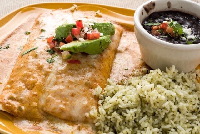 **Vegetarian** Cheese enchiladas topped with your choice of sauce. Served with black beans and cilantro rice.