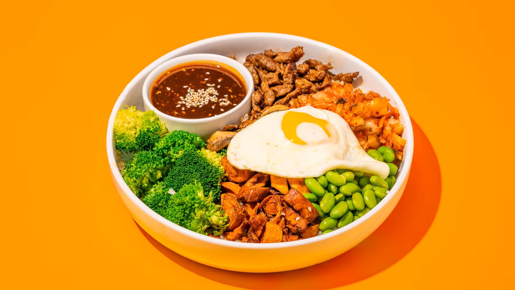 (5 oz) Your choice of base with bulgogi beef, sauteed mushrooms, chopped kimchi, sweet potatoes, broccoli, edamame, fried egg and spicy Korean BBQ sauce.