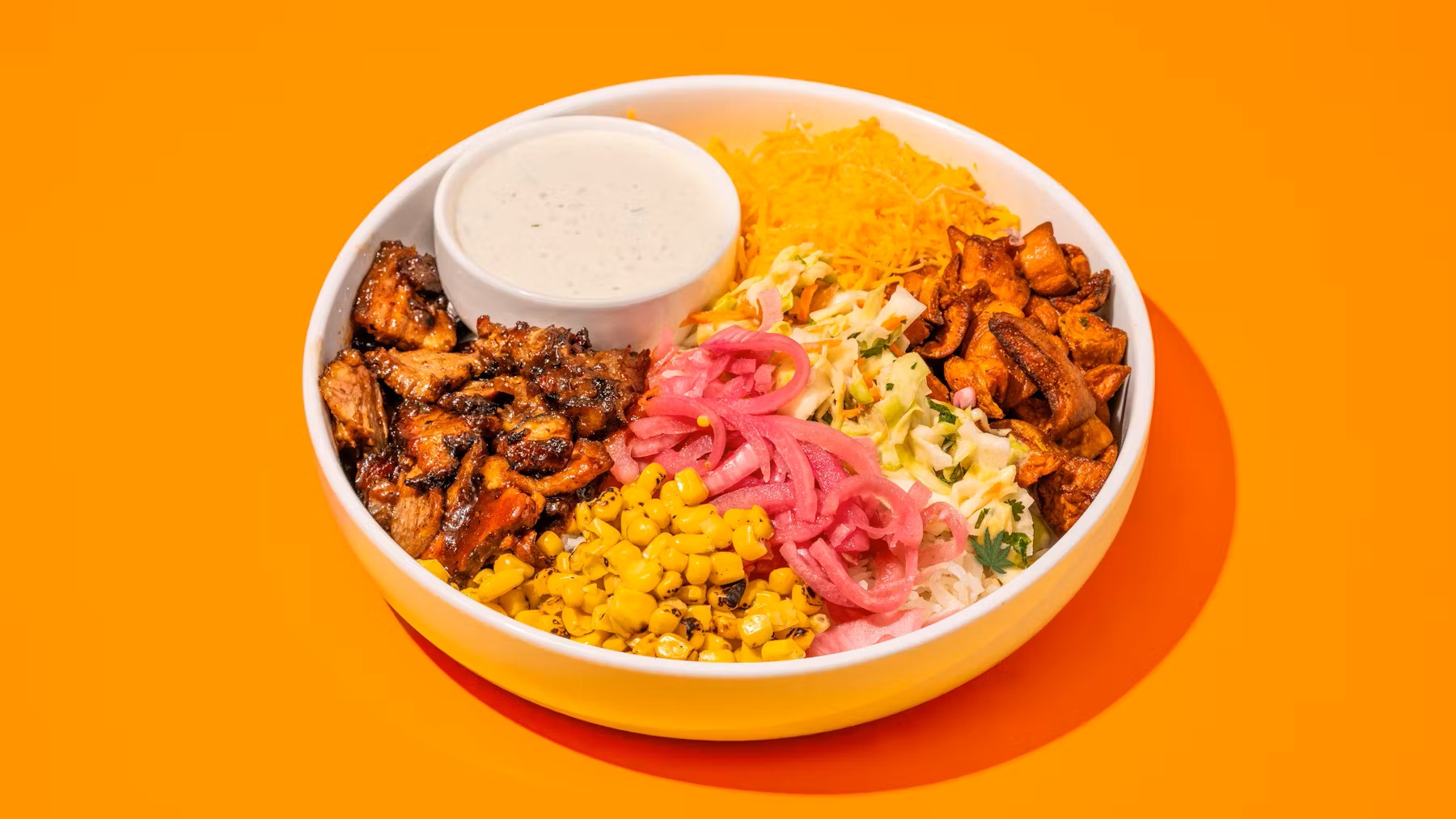 (5 oz) Your choice of base with smoked BBQ brisket, shredded cheddar cheese, charred corn, pickled onions, coleslaw, sweet potatoes and lemon ranch dressing.