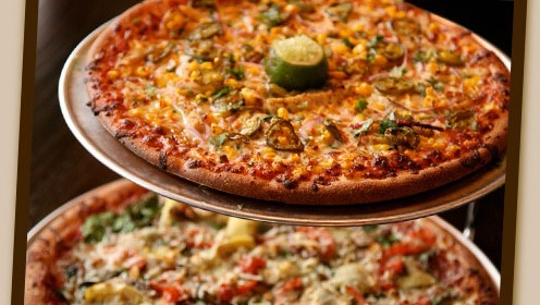 Spicy red sauce, chicken, red onions, roasted corn, jalapenos, garlic and mozzarella, topped with cilantro and squeeze of lime.