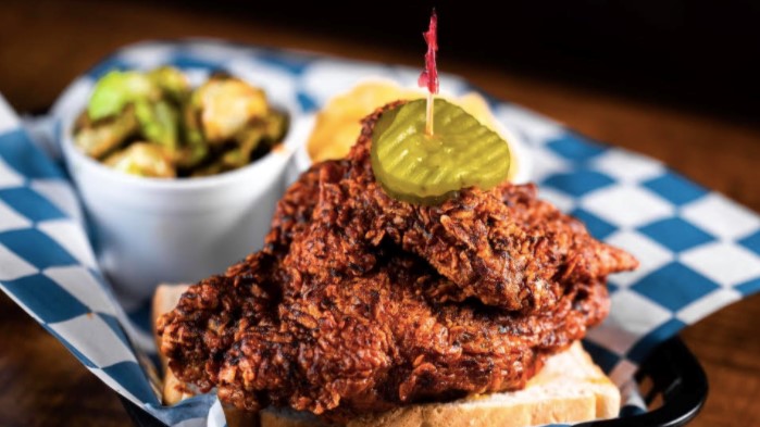 5 oz chicken breast with PHC pimento cheese and pickles. Served with one side.