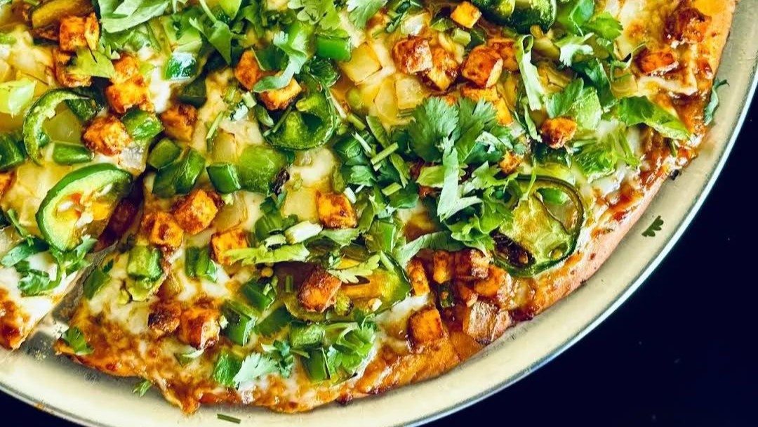 Jain red sauce, bell pepper, cheese, jalapeno, spicy jain corn, Achari Masala and cilantro.