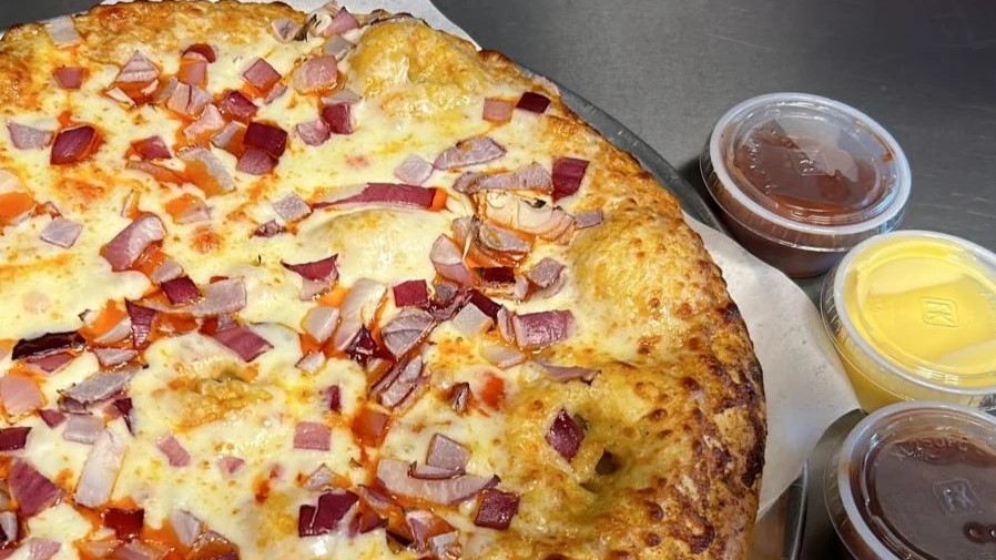 Roasted chicken, BBQ sauce, onion, mozzarella and cheddar cheese.