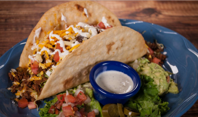 Your choice of two tacos loaded with shredded lettuce, diced tomatoes and grated cheese, served with Mexican rice, your choice of beans, chips and salsa.