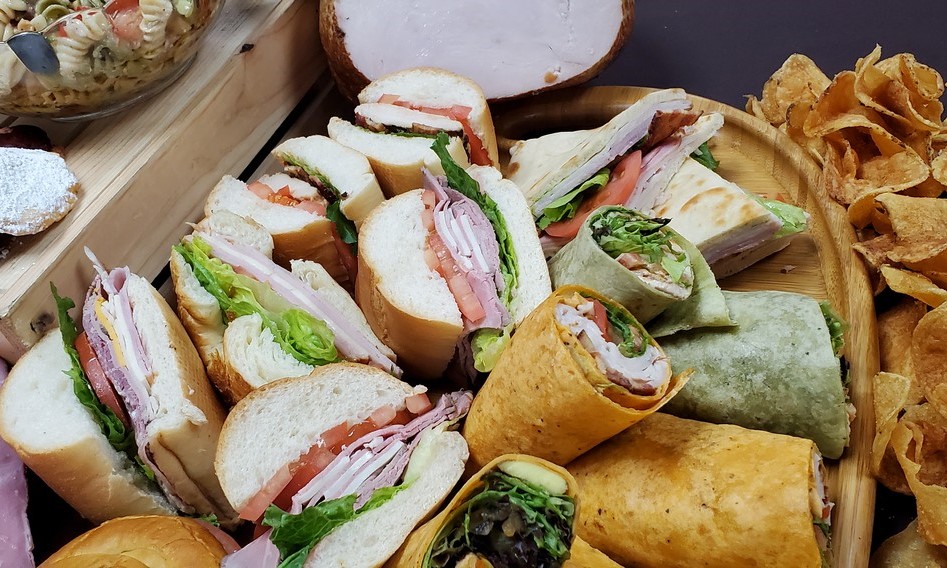 (Serves 10) A full tray of sandwiches, your choice of a half tray of salad, and a gallon of iced tea or two 2-liters of soda.