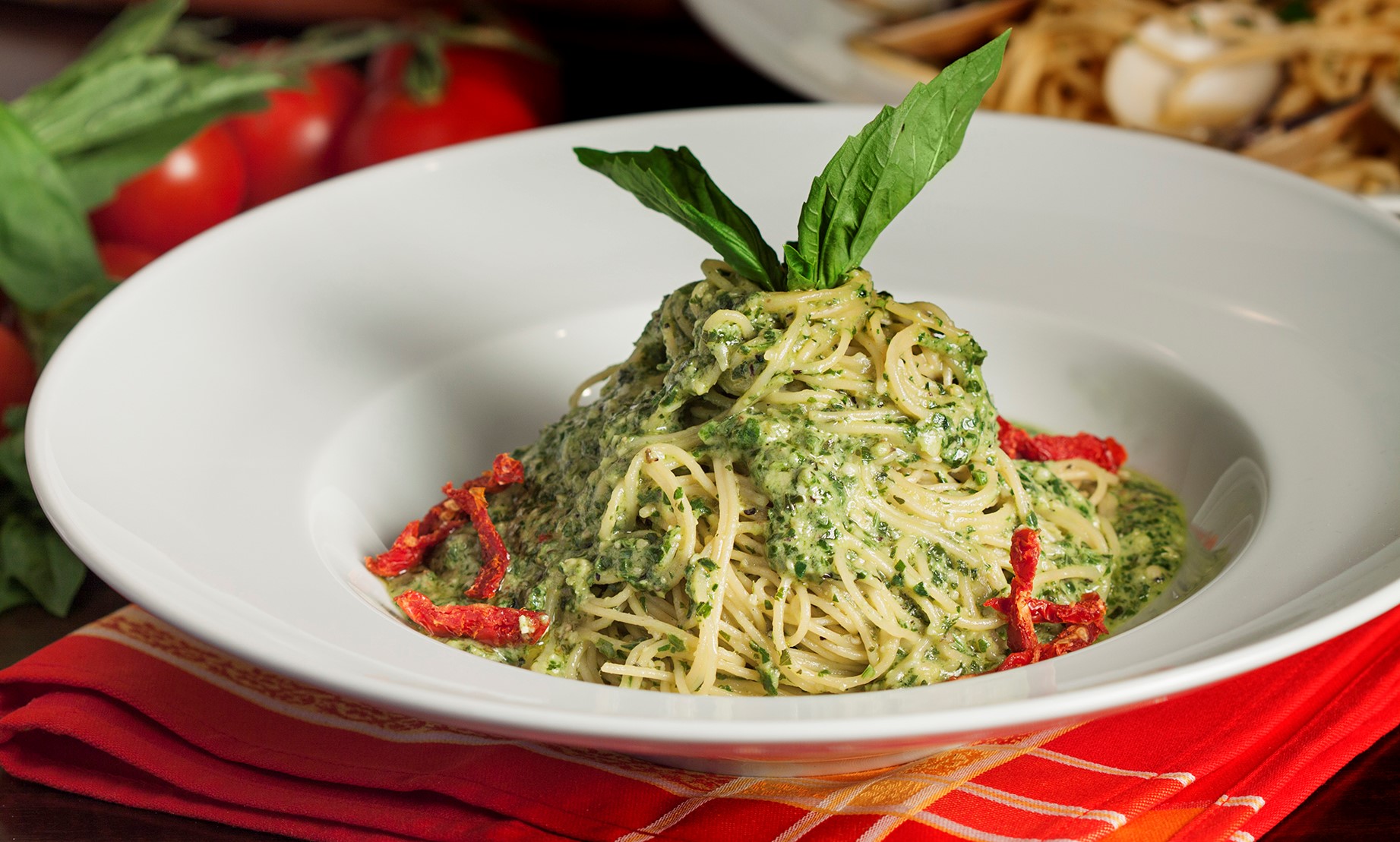 (Serves 6-8) Cheese-stuffed tortellini pasta made with Sicilian extra virgin olive oil in a pistachio pesto cream sauce.