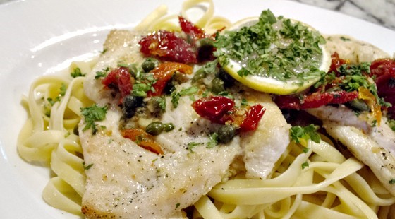 (Serves 6-8) Fresh chicken sauteed with mushrooms, capers, spinach, and tomatoes in white wine lemon garlic sauce, over fettuccine pasta with Sicilian extra virgin olive oil.