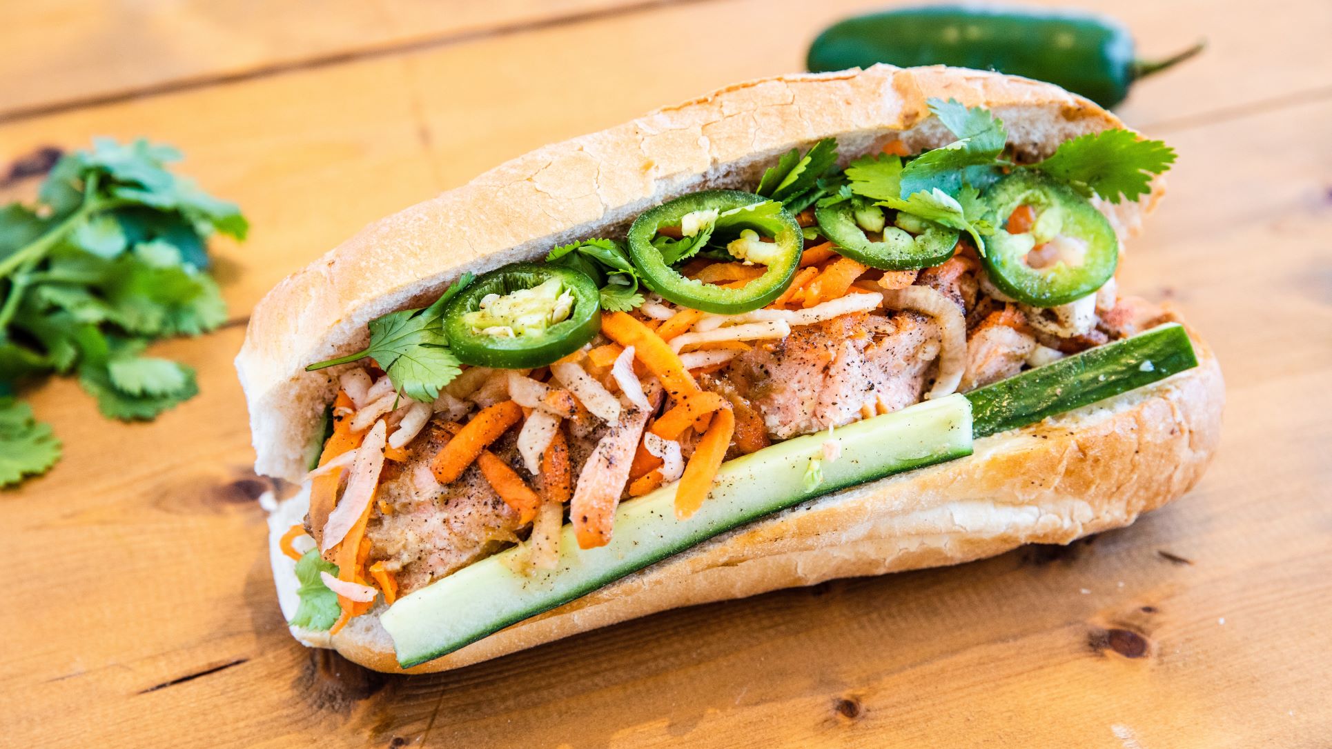 Served with Vietnamese buttery mayo, cucumber, pickled carrots, pickled daikon, cilantro, and jalapenos with a dash of seasoning sauce in a crispy baguette. Served with a side salad and a cookie.