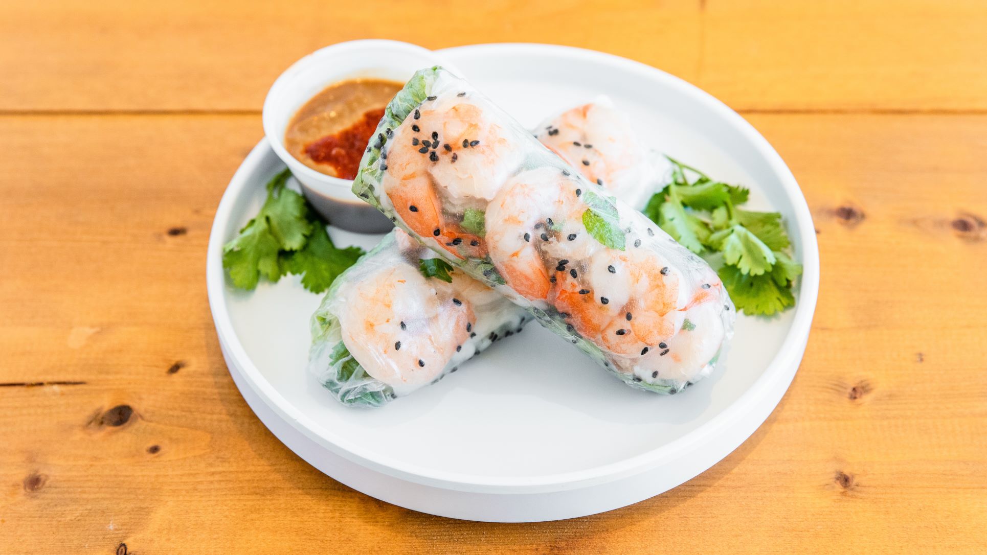 Perfectly poached shrimp and braised pork belly wrapped with rice paper, with vermicelli, cucumber, lettuce, pickled carrots, pickled daikon, and mint. Served with our peanut dipping sauce.