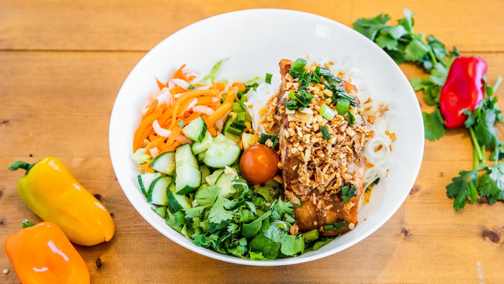 A bed of vermicelli noodles, lettuce, cilantro, mint, pickled carrots, pickled daikon, cucumber, and topped with green scallion oil, peanuts, and crispy fried shallots. Served with our traditional ...