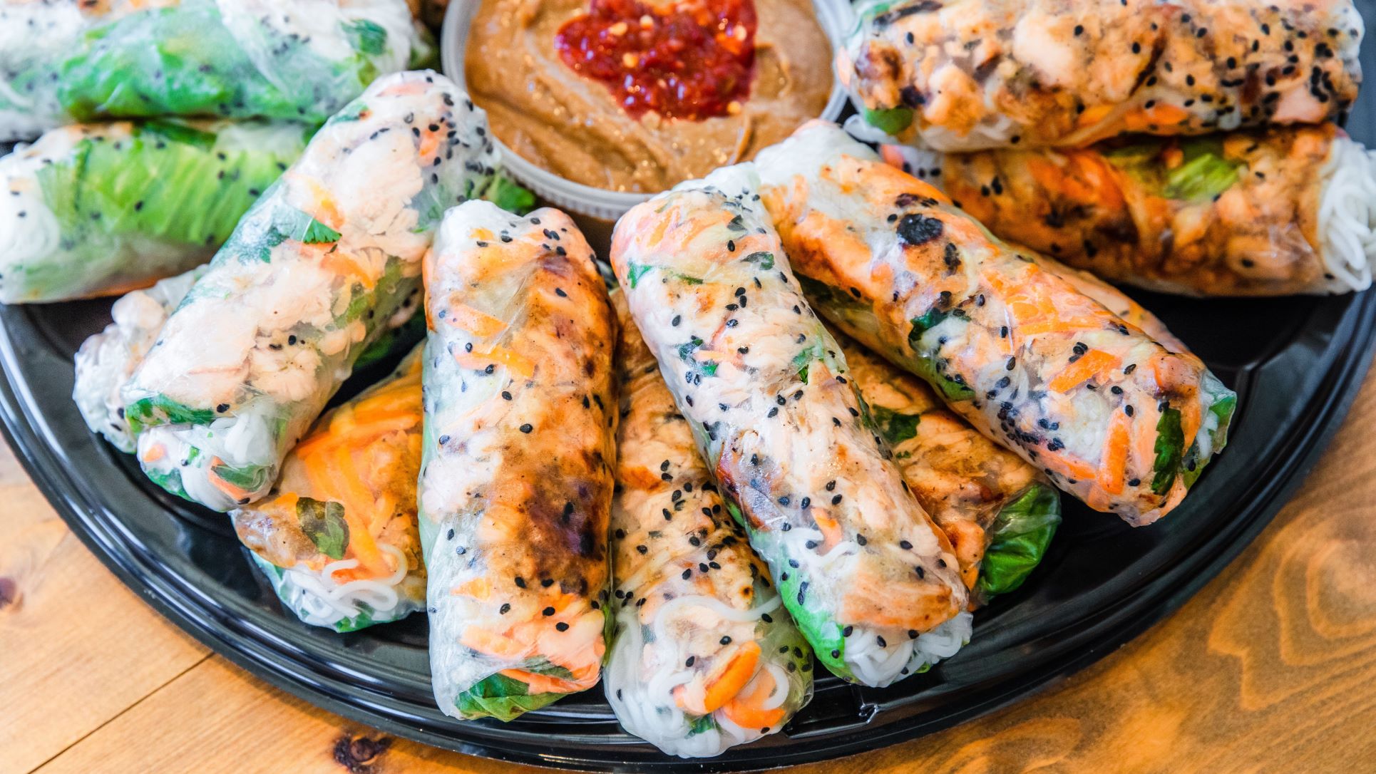 (48 Rolls) Baked and broiled salmon in a honey, lemongrass glaze wrapped with rice paper with vermicelli, cucumber, lettuce, pickled carrots, pickled daikon, and mint. Served with our peanut dippin...