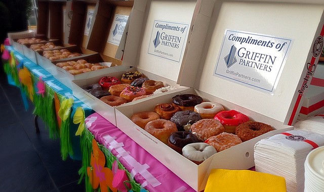 (Serves 10-15) 2 dozen mixed variety of donuts, 2 dozen snack sized kolaches and one 96 oz. coffee to go with set ups.
