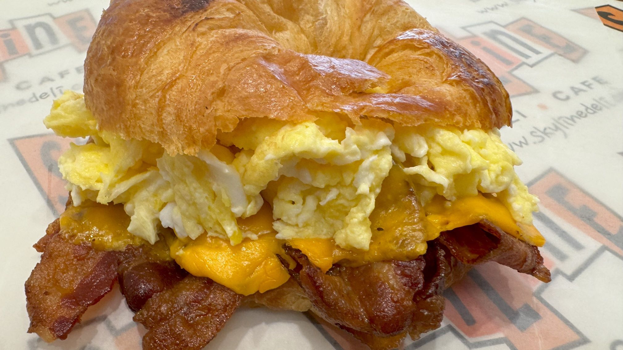 Scrambled eggs, cheese and your choice of bacon, sausage, or ham on a flaky croissant.