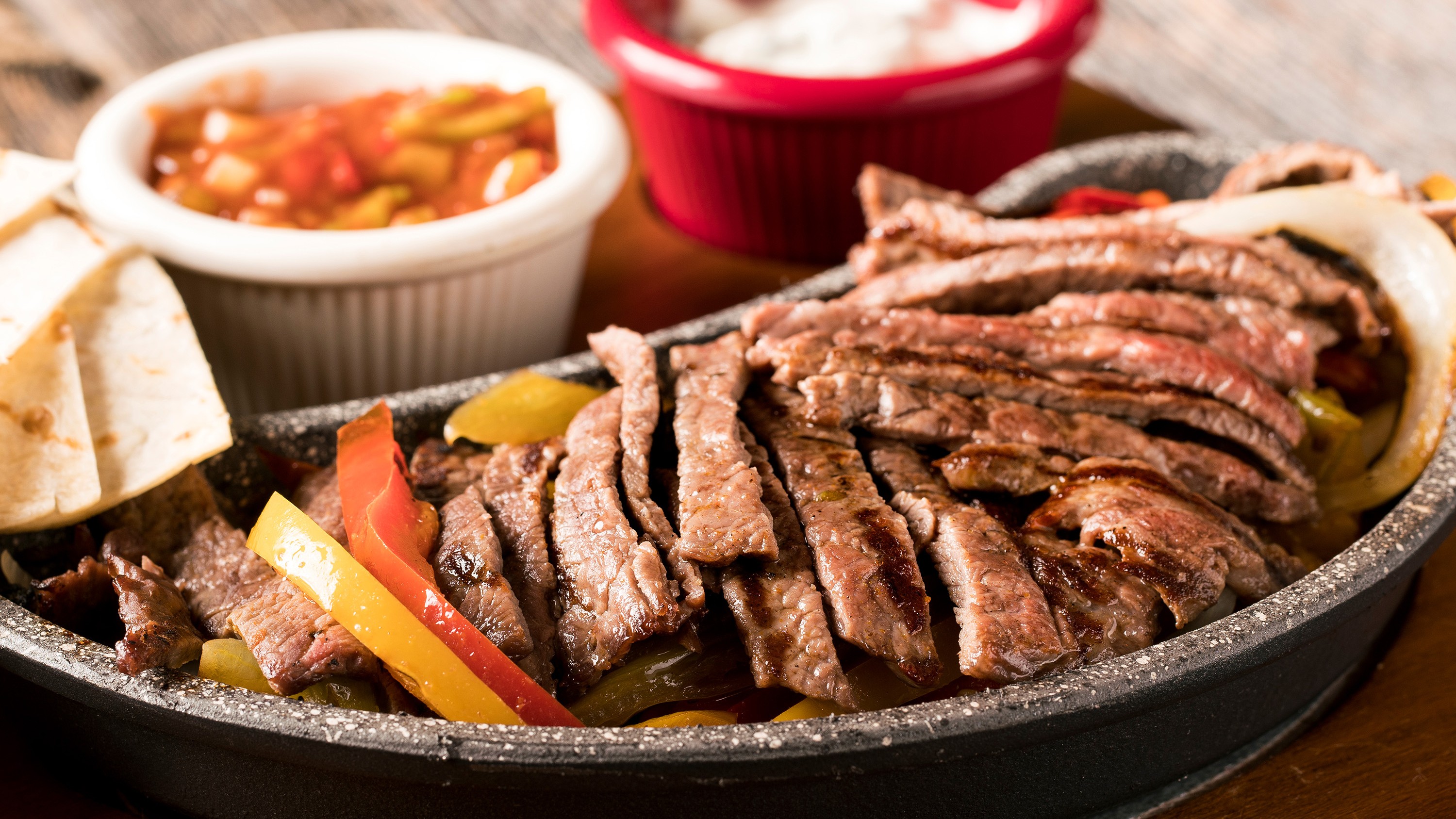 (Serves 10-12) Beef Fajita tray, with two trays of sides and an ultimate toppings package that includes salsa, guacamole, pico de gallo, sour cream and shredded cheese.