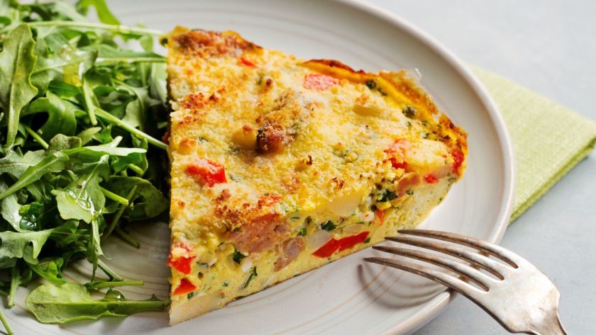 (Serves 10-12) Baked classic with spinach, onion, potato and your hoice of ham, turkey bacon, bacon or mixed veggies.