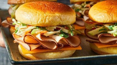 Smoked ham, smoked turkey breast, crispy bacon, American cheese, lettuce and tomatoes, on your choice of bread and one side.