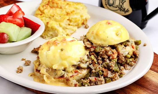 (Per person / 10 Minimum) Scrambled eggs, hash brown casserole, choice of bacon (3 pieces per person), sausage patties (2 per person), or ham (1 per person), and a piece of French toast.