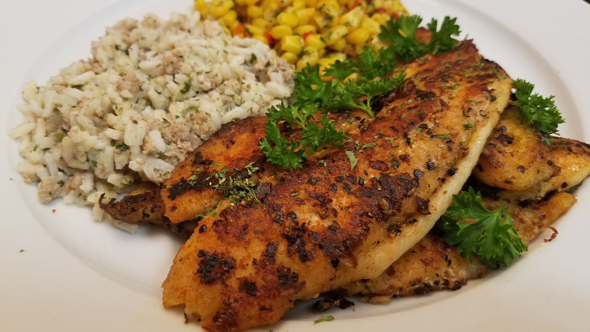 Tilapia served with green leaf salad, a dinner roll and your choice of one side.