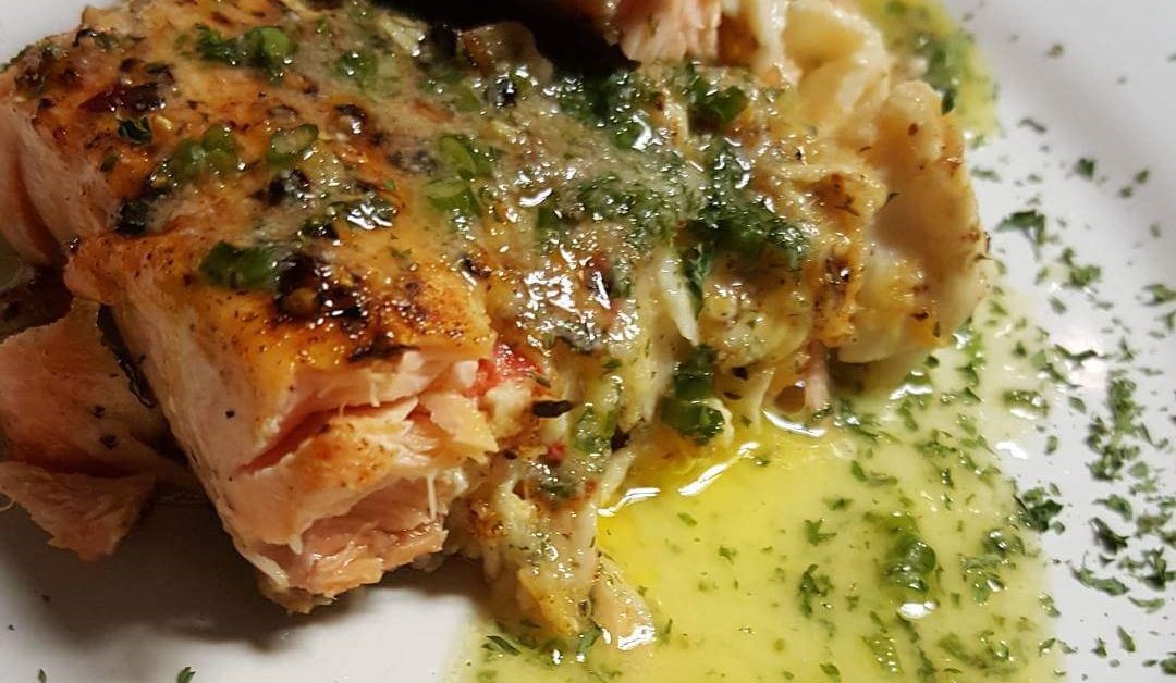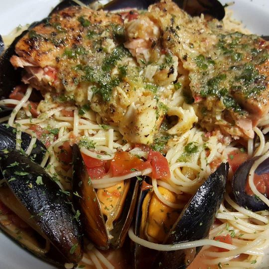 Served with cram wine sauce, lobster, crabmeat, crawfish and shrimp over wild rice. green leaf salad, a dinner roll and your choice of one side.