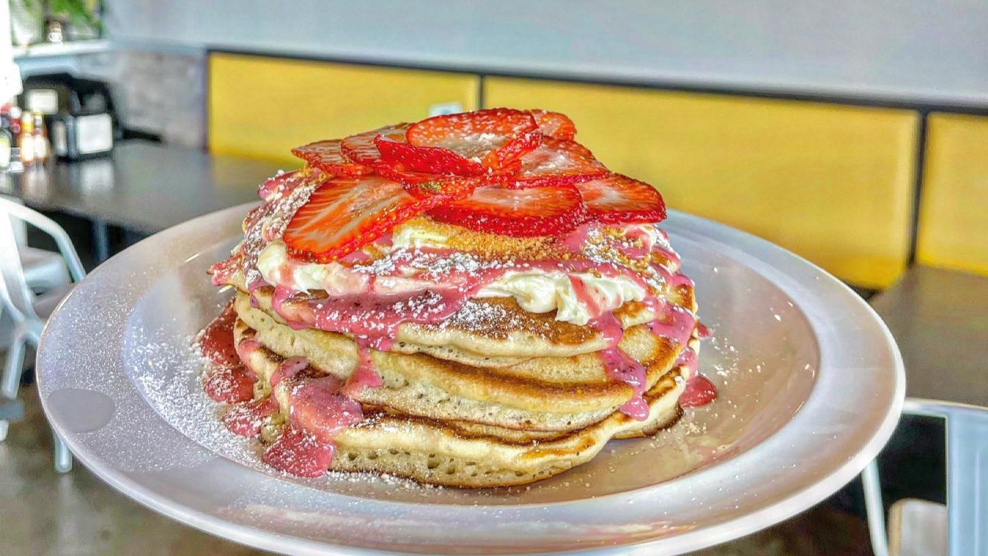 Two sweet cream pancakes with Mazapan crumbles, vanilla cream, caramel drizzle, and whipped cream.
