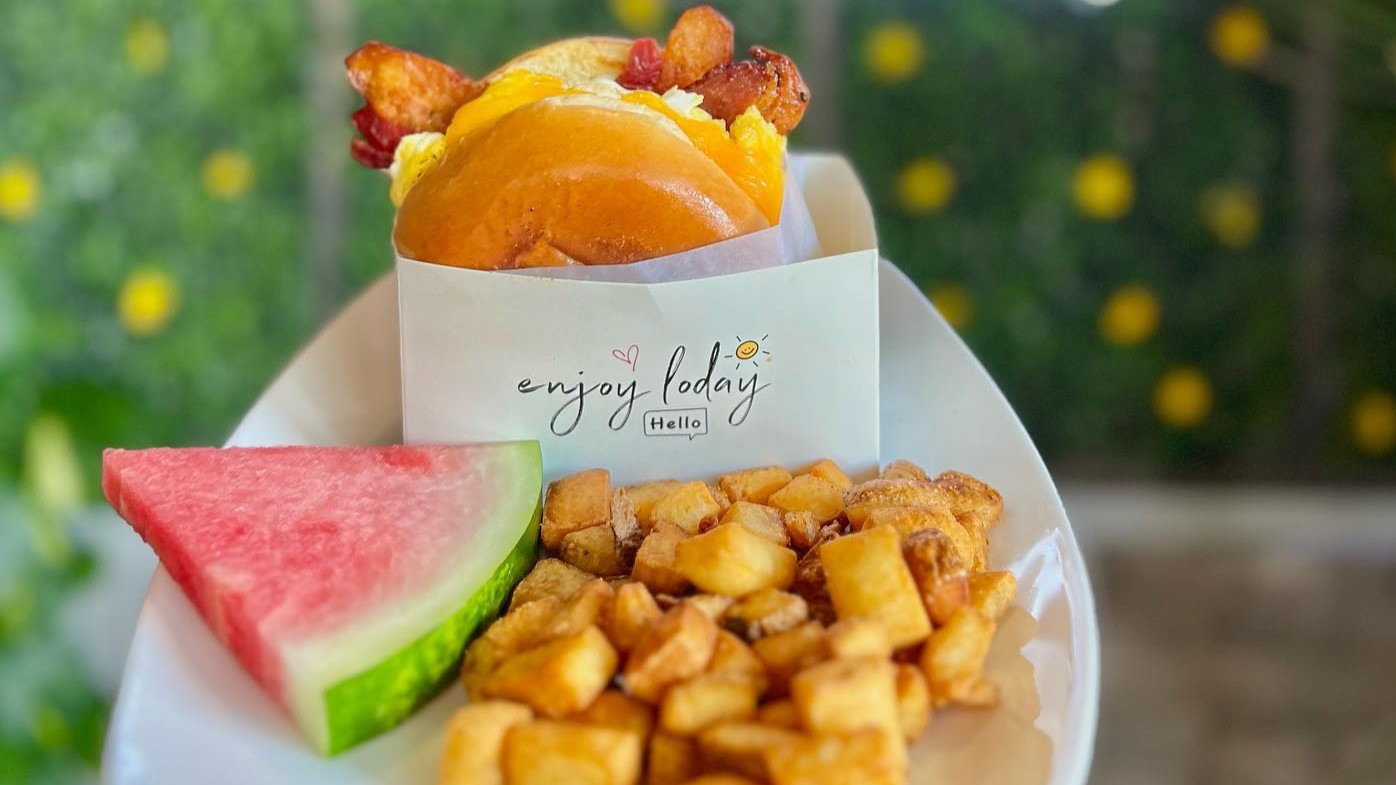 One egg with sharp cheddar cheese, mayo, and your choice of bacon, sausage or ham on a brioche bun. Served with potatoes.