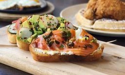 (Per piece) House cured applewood salmon, garlic herb cream cheese, fried capers and dill.