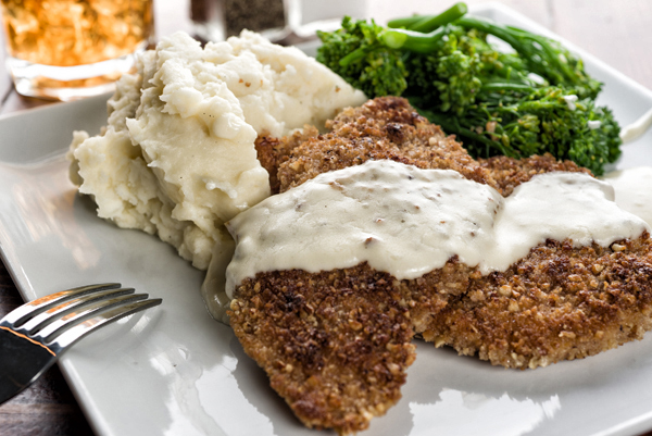6 oz. chicken breast coated with a pecan breaded mix, served with mashed potatoes and broccoli with a warm beurre blanc sauce.