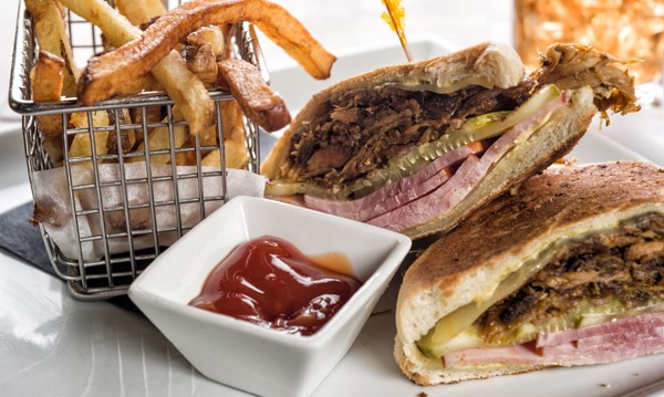 Canadian bacon, pulled pork, pickles, Dijon mustard and Swiss cheese on ciabatta bread. Served with homemade chips and a cookie.