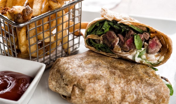 Grilled tender steak, blue cheese aioli, arugula, caramelized onions and spring mix rolled in a tortilla wrap. Served with homemade chips and a cookie.
