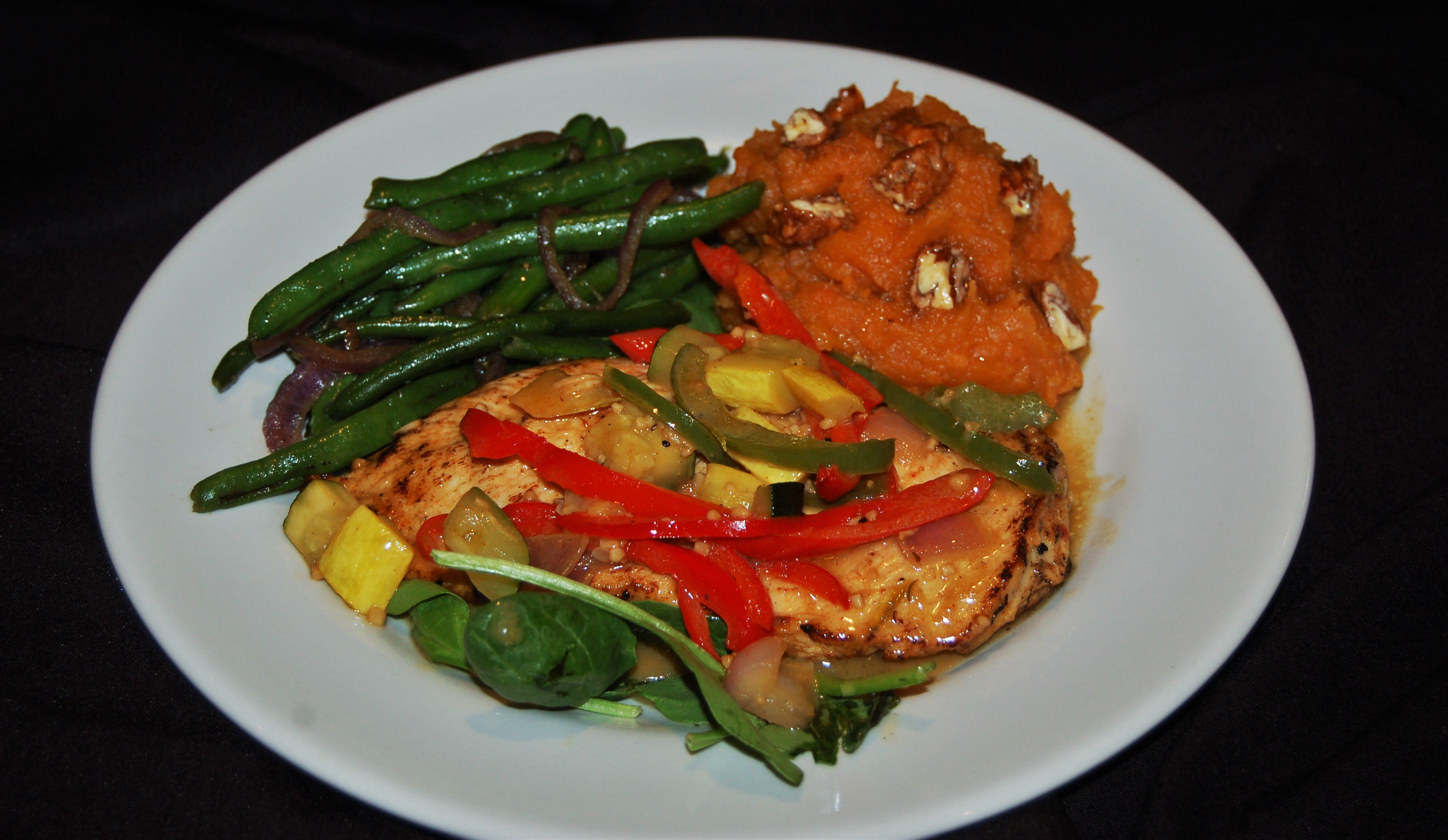 (5 minimum) Gluten Free! Grilled chicken breast topped with a light white wine sauce with diced zucchini, squash, spinach, onions and bell peppers. Served with white rice, house salad and rolls an...