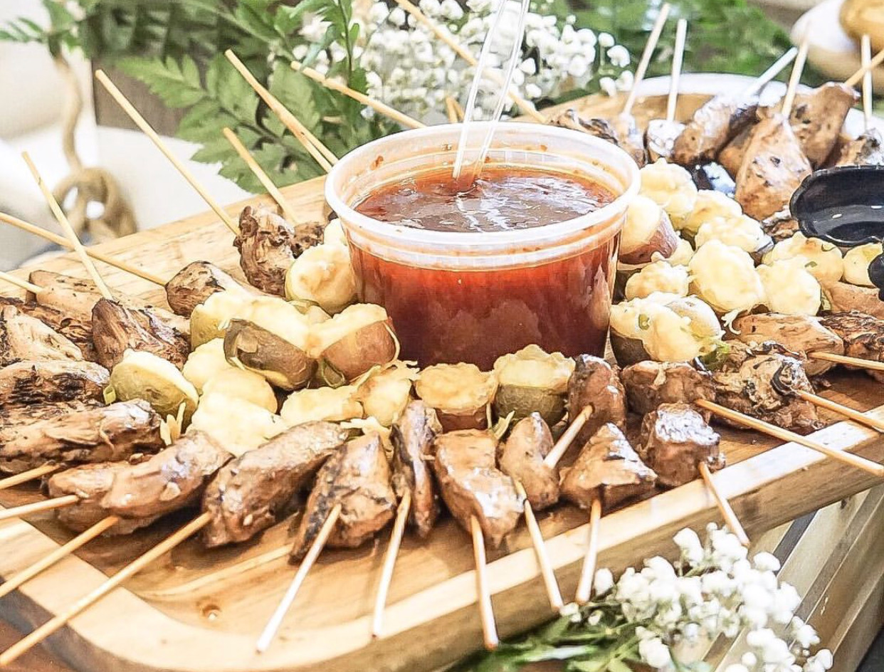 (20 minimum) Beef tenderloin braised in a bourbon sauce. Served on a skewer.
