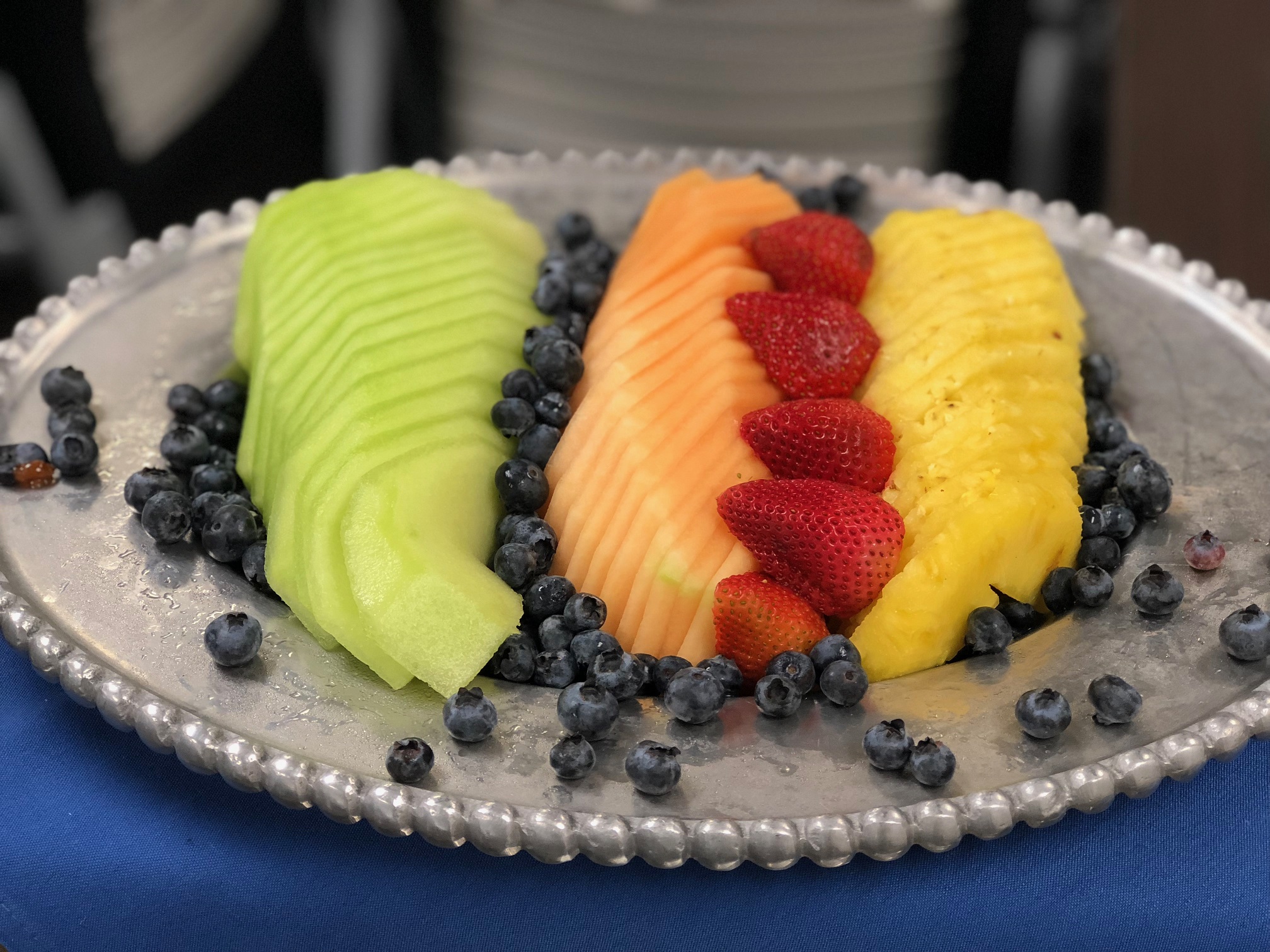 (10 minimum) Apples, bananas, grapes, pineapple, honeydew, cantaloupe, watermelon, and blueberries.